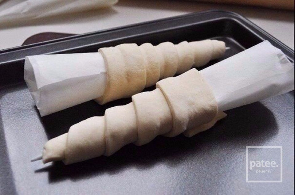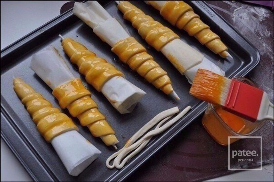 3. Из кондитерской бумаги нарезать треугольники, из которых свернуть кулечки-корнетики. Это будущие насадки для трубочек.4. Обернуть каждую полоску вокруг своей трубочки, начиная от узкого конца трубочки (полоски должны перекрывать друг друга). Положить на противень.