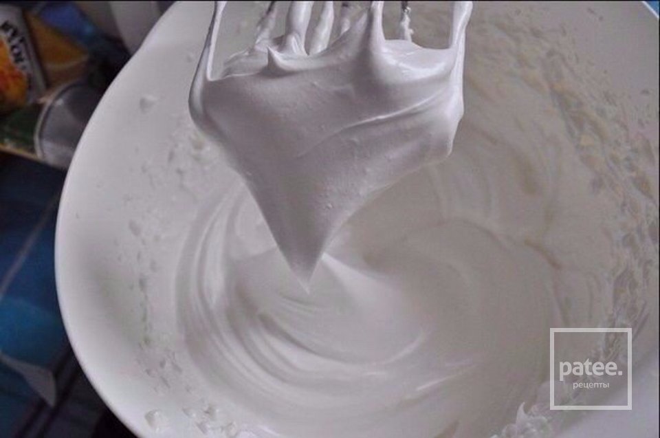 6. Приготовить белковый крем. Для этого воду с сахаром нагреть до температуры 118°C (или до пробы на средний шарик). Белки взбить со щепоткой лимонной кислоты до крепкой пены. Влить в белки сироп на большой скорости миксера. Взбивать до тех пор, пока белковая масса не остынет.7. Переложить белковый крем в кондитерский мешок и наполнить им трубочки.