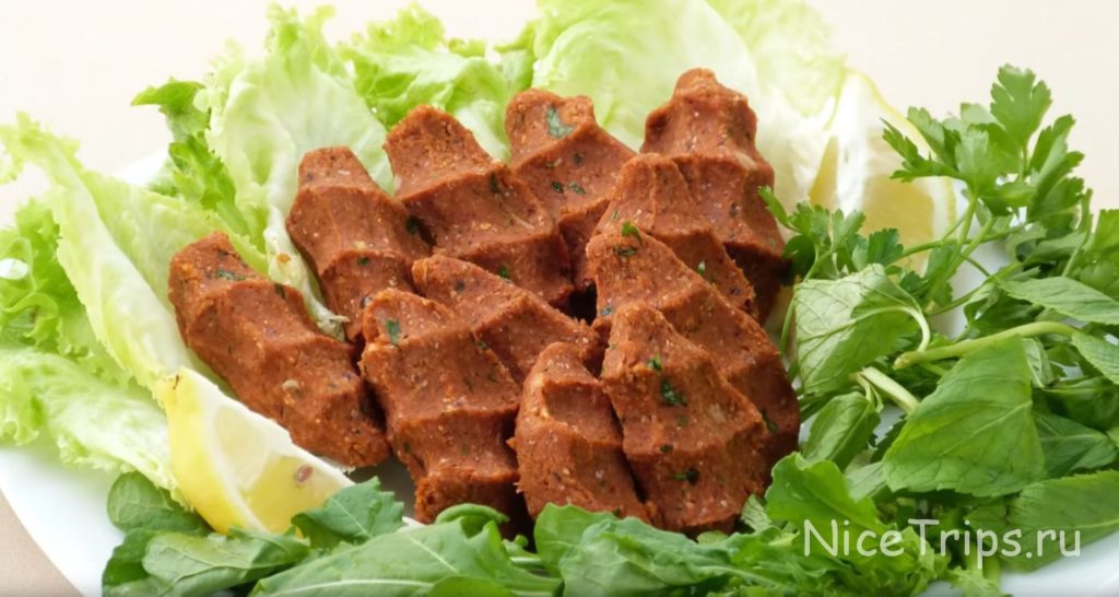 Çiğ köfte — пряные шарики, приготовленные из булгура, лука, перца, томатной пасты, специй и трав. Подаются на листе салата.