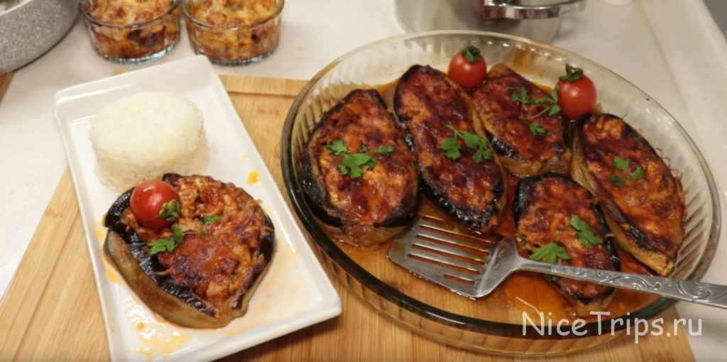 Сочные, запеченные баклажаны, фаршированные рубленой говядиной, обжаренным в масле луком, чесноком, помидорами, свежей петрушкой. Заправлены ароматной смесью турецких специй.