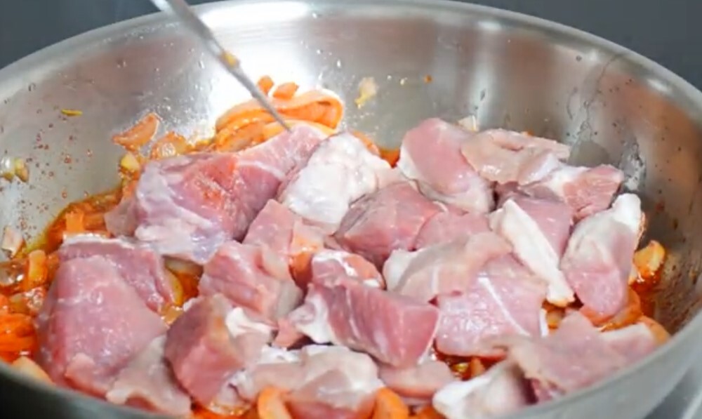В обжаренные лук и чеснок выкладываем кусочки порезанного мяса. Перемешиваем, слегка обжариваем.