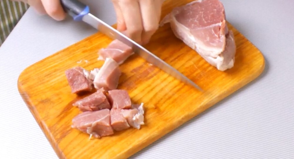 Первым делом подготовим все необходимые продукты, которые у нас по списку. И так, мясо нарезаем ножом на пластинки, затем на кусочки небольшого размера. Отставляем в сторонку.