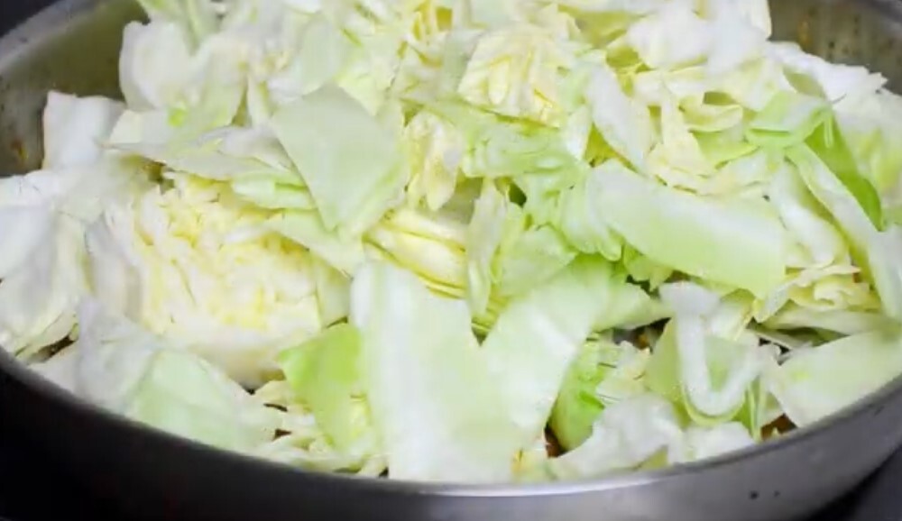 В отдельной объемной кастрюле доводим до кипения два стакана воды и опускаем в нее нашинкованную капусту. В этой кастрюле впоследствии будем доводить до готовности все блюдо. Закрываем кастрюлю крышкой и варим содержимое при низкой температуре десять-пятнадцать минут.