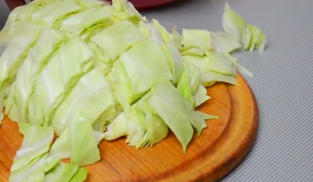 Пока мясо с грибами и луком обжариваются, тонко шинкуем белокочанную капусту.