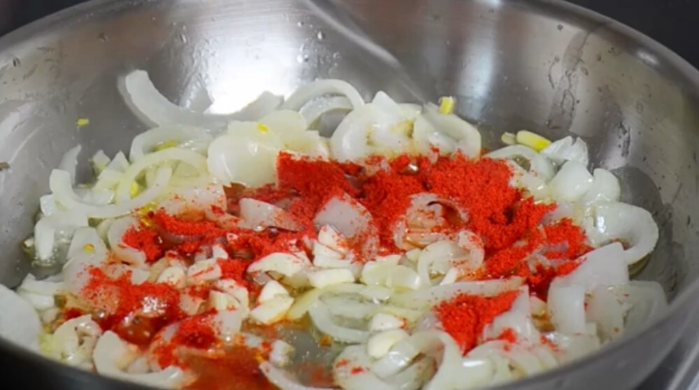 Ставим сковороду на плиту, наливаем в неё растительное масло и ждем когда накалится. В это время головку репчатого лука очищаем от шелухи и режем полукольцами. Зубчики чеснока так же очищаем и измельчаем на мелкие кусочки. Отправляем это всё в разогретую сковороду. Сверху посыпаем паприкой, перемешиваем и обжариваем 1-2 минуты.