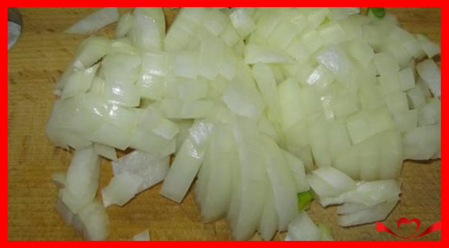 Лук чистим и нарезаем тонкими полукольцами или четверть-кольцами.