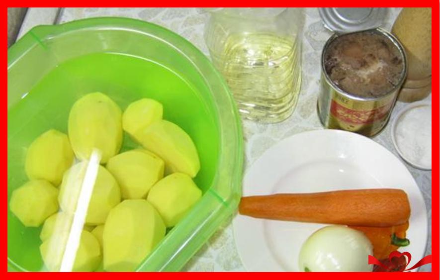 Выглядит технология приготовления картошки с томатной пастой и тушенкой следующим образом: