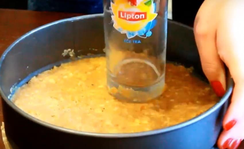 - Теперь нам понадобится круглая форма для выпечки, у которой можно отделить бортики от донышка. Выкладываем в нее массу из печенья и масла. Распределяем ее ровно по дну формы ложкой. Плотно накрываем форму сверху пищевой пленкой и ставим в холодильник на 30 минут.