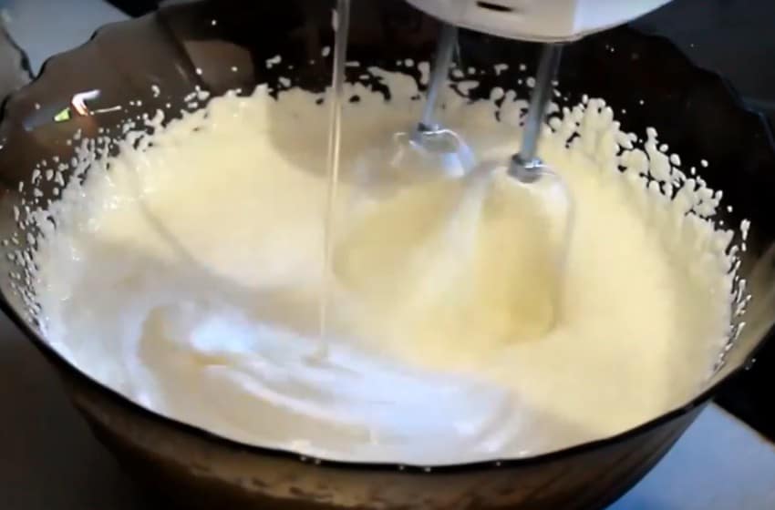 - Блюдо готовится в 2 этапа. Сначала желатин делят пополам и заливают для набухания в двух емкостях. В это время сахарозаменитель смешивают с желтками и взбивают до пышности и воздушности.