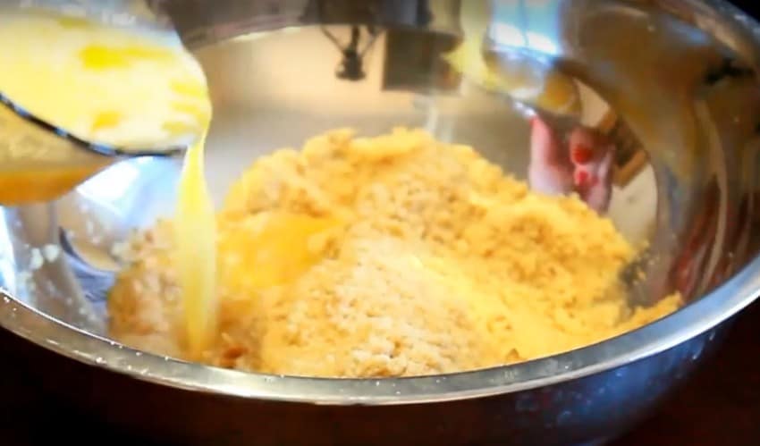 - Оставшийся песок понадобится всыпать в творожную массу, и все тщательно перемешать. Сладкие крупинки должны в ней полностью раствориться.