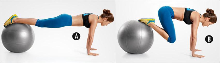 Еще одно движение с гимнастическим мячом, которое делают в тренажерном зале или дома, если имеется фитбол. Нужно принять упор лежа, положив ноги в районе голеней на мяч. С напряженным прессом начните подтягивать колени к груди, перекатывая мяч к уровню бедер. Остановите движение в тот момент, когда бедра будут перпендикулярны относительно пола, после чего возвращайтесь в исходную позицию. Рекомендовано выполнять по 15-20 повторений. Упражнение несложное, но к нему нужно привыкнуть. Новичкам бывает трудно поддерживать равновесие.