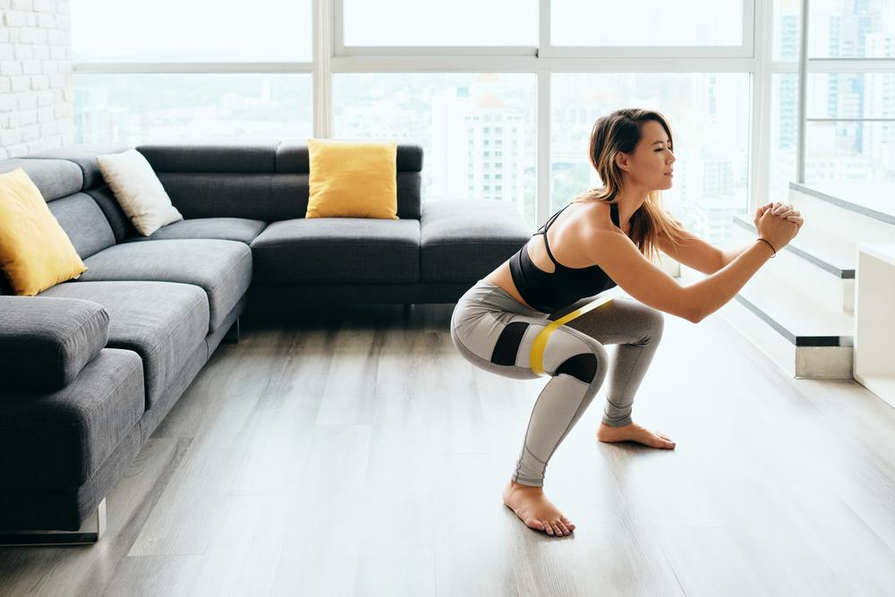 2. Приседания с резинкой. Натяните резинку между ног на бедрах. Руки сомкните в кулак перед собой и медленно приседайте, расставив ноги на ширине плеч. Упражнение задействует мышцы ног, бедер и ягодиц.