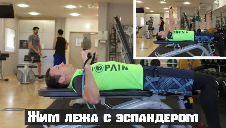Это упражнение, отлично знакомо любому человеку. В основном все привыкли выполнять его со ШТАНГОЙ или ГАНТЕЛЯМИ. Но в нашем случае, мы будем использовать резиновый эспандер. Данное упражнение, поможет проработать большие грудные мышцы.