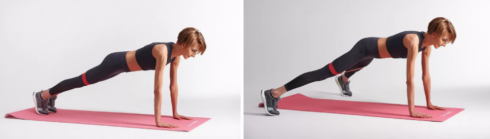 Если вы хотите похудеть в области бедер и ягодиц, можете выполнять махи ногами в сторону. Фитнес-резинка должна быть на уровне коленей.