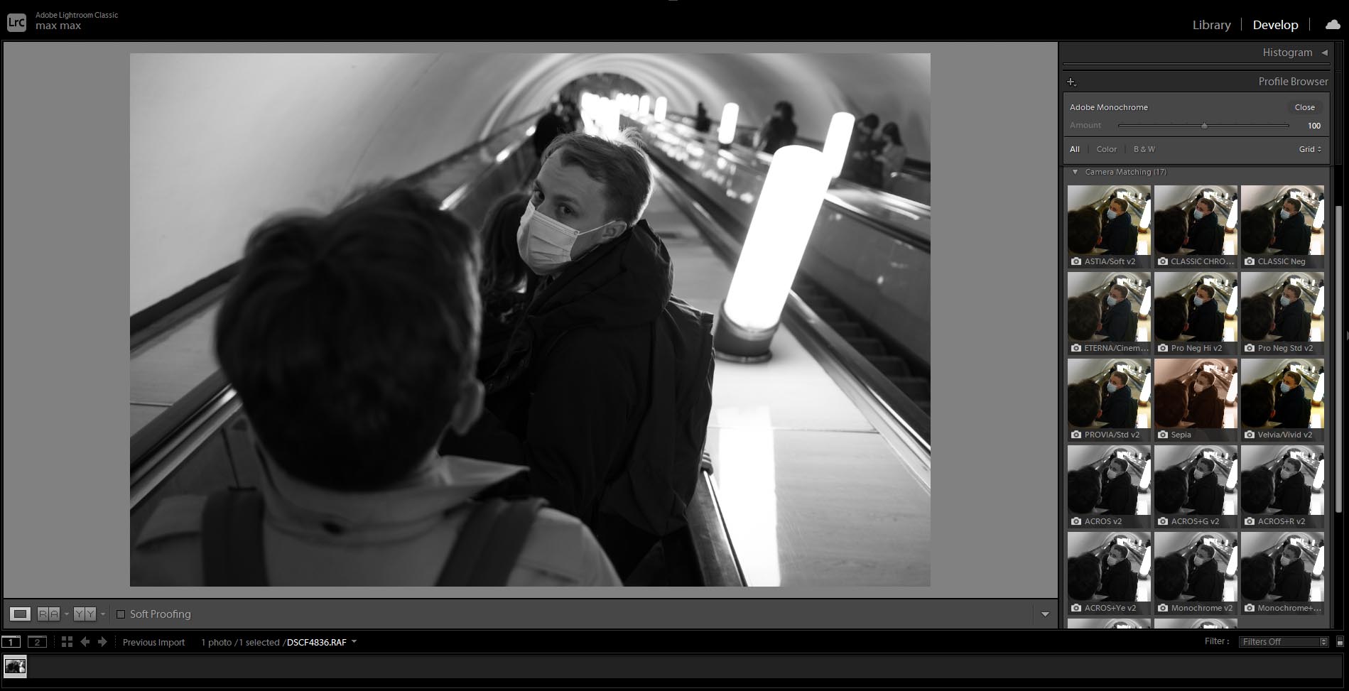В случае, если вы снимаете в RAW, то Lightroom знает эти цветовые плёночные пресеты, поэтому прямо в импорте фотографии вы можете выбрать один из них. При этом в «Лайтруме» вы сможете отличать по названиям самой плёнки, выпускаемой «Фуджи» — Astia, Velvia, Acros и другие: