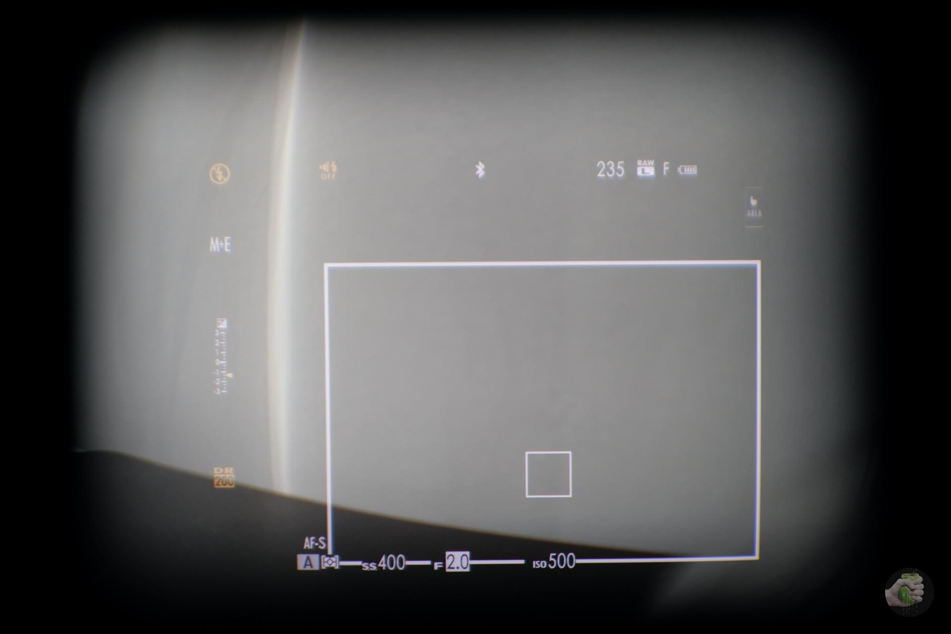Снимать можно как с помощью экрана, так и гибридного видоискателя. Его поле зрения гораздо больше, чем реально видит объектив, но зато вся необходимая для съёмки информация не мешает поиску кадра, который выделен прямоугольником: