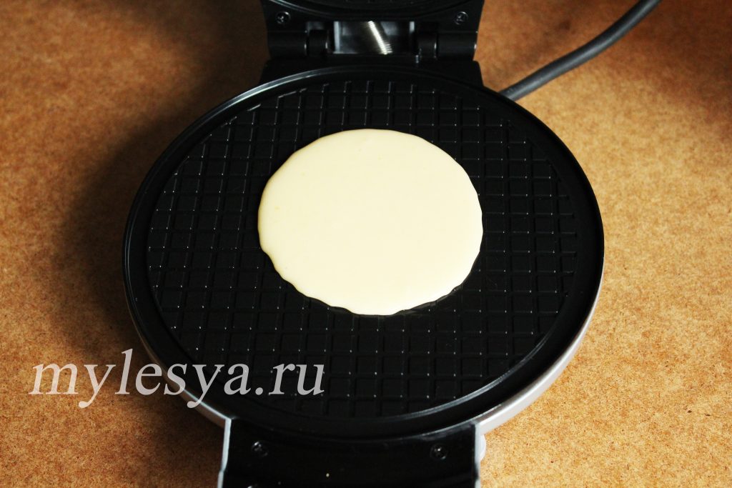 4. Включаем плиту и нагреваем вафельницу почти до красна. Заливаем тесто около двух столовых ложек. Его нужно разлить равномерно и следить за тем, чтобы оно не выползало за край.