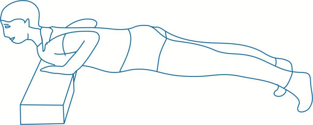 - Принимаете горизонтальное положение – пальцы ног упираются в пол, а предплечья установлены на скамейке. Локтевой сустав находится под плечевым. Старайтесь, чтобы спина была ровной, без чрезмерного прогиба в пояснице. Живот напряжен. Далее поочередно выпрямляете правую и левую руки, переходя в положение для отжимания. Далее вновь опускаетесь на предплечья. И снова поднимаетесь. Во время выполнения техники корпус должен оставаться прямым.