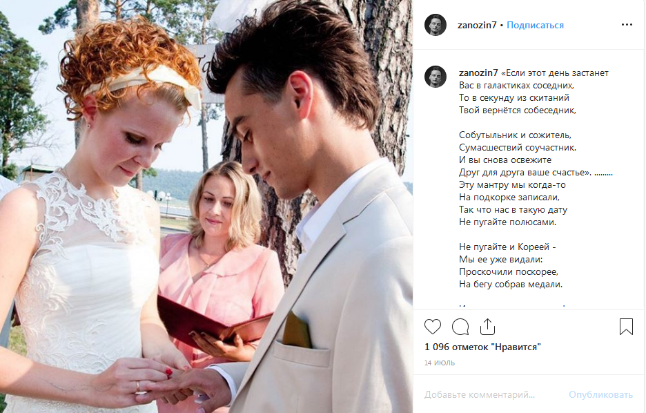 Вскоре он переехал к возлюбленной, и началась их совместная жизнь. Ведущий несколько раз звал ее замуж. Первый раз это случилось в Париже, когда они были на Эйфелевой башне, но тогда красавица не дала согласие на брак, признавшись, что не хочет торопить события. Позднее Занозин еще несколько раз заводил разговор на эту тему, но все было безрезультатно. Лишь через четыре года совместной жизни влюбленные отпраздновали свою свадьбу, хотя она не сыграла большой роли и не изменила их отношений.